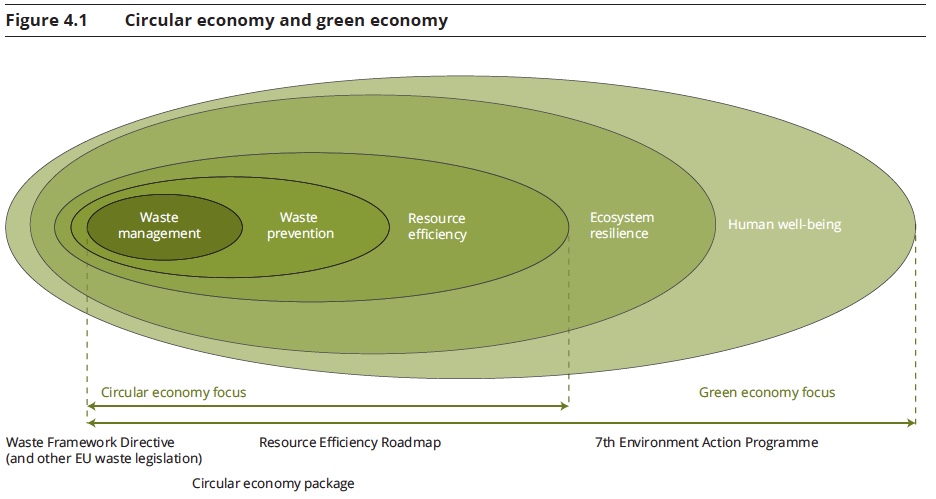 A figura abaixo demonstra os limites da abordagem da Ecologia Circular e sua interrelação com a Economia Verde, que aborda ainda os conceitos da resiliência dos ecossistemas de suporte e o bem-estar humano.