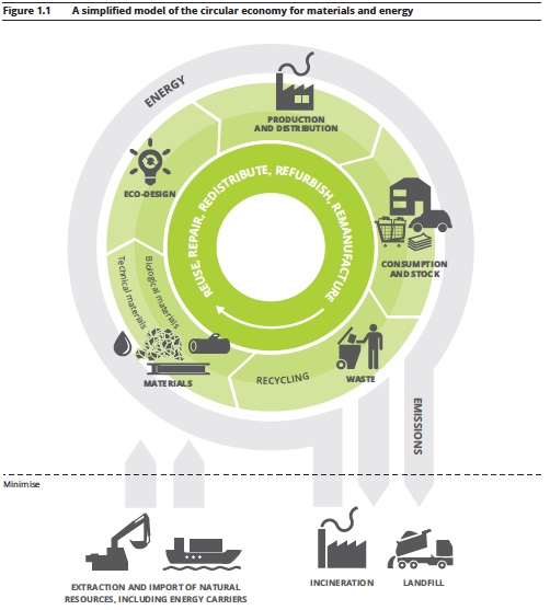 A primeira parte do relatório deixa explícitas quatro pressões para adotar uma Economia Circular: Evitar impactos ambientais e sobre a saúde pública relacionados à economia linear, evitar o uso ineficiente de recursos naturais e evitar a dependência de recursos externos à União Europeia.