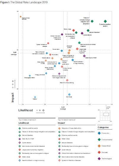 Em 2019 os especialistas identificaram riscos relacionados aos eventos climáticos extremos, às falhas em mitigação ou adaptação às mudanças climáticas, desastres naturais, ciberataques, desastres ambientais causados pelo homem, crises na água e colapsos em ecossistemas e perda de biodiversidade, todos estes com alto potencial de impacto e alta probabilidade de ocorrência, conforme demonstra o gráfico abaixo.