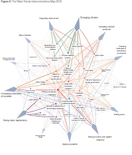 Uma ruptura nos nós de rede com maior impacto e probabilidade de ocorrência, citados anteriormente, tem efeitos sinergísticos sobre todos os fatores a eles interligados. Eventos climáticos extremos, falhas na mitigação e adaptação às mudanças climáticos, crises na produção de alimentos, falhas em governança nacional, migração involuntária e instabilidade social, dentre outros fatores, estão interligados.