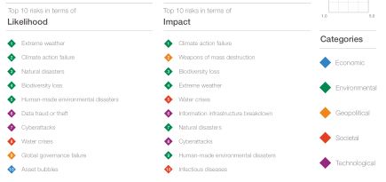 As probabilidades de ocorrência são diretamente afetadas pelos dados coletados durante o ano de 2019 e às informações disponíveis aos públicos de interesse, bem como a percepção construída de que os fatores ambientais, sociais e econômicos estão intrinsecamente ligados. Eventos climáticos extremos, falhas em ações relacionadas às mudanças climáticas no que tange à mitigação das emissões e adaptação às mudanças já observadas, desastres naturais aumentando em frequência e intensidade, a perda de biodiversidade associada aos desastres naturais e eventos extremos, bem como à superexploração de recursos naturais renováveis, aos desastres naturais causados por humanos, como as queimadas na Austrália e Brasil. Completam a lista das 10 maiores probabilidades as fraudes eletrônicas, ciberataques à infraestrutura de países, crises hídricas, falhas na governança global e bolhas financeiras.