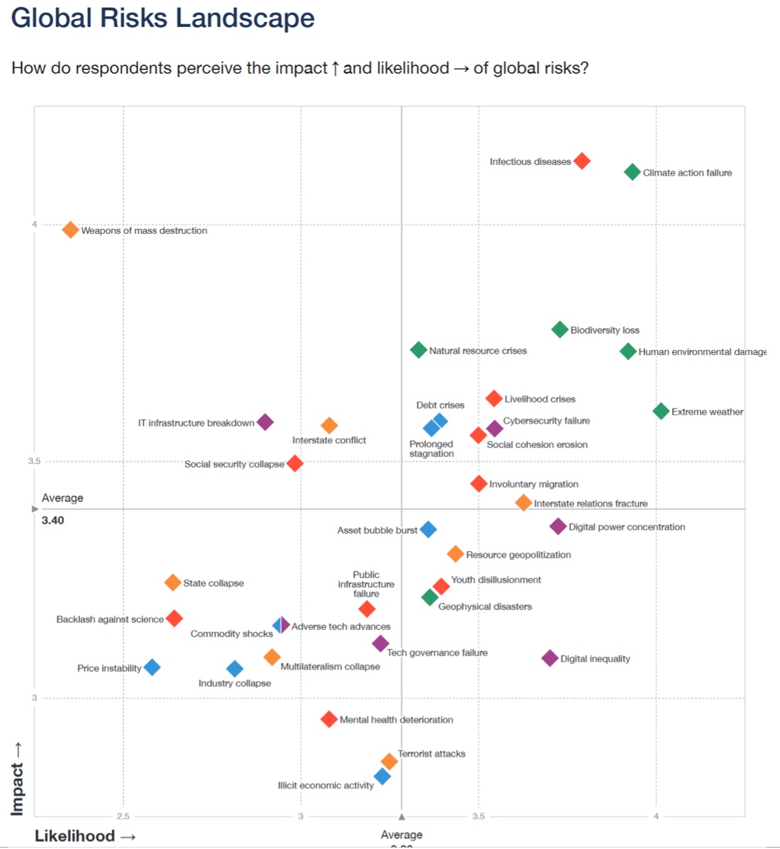 Seguindo o processo anual de publicação dos principais riscos globais divulgados no Global Risks Report, acreditamos que contribuímos para a divulgação de informação relevante para identificação de cenários, pois representa a visão de tomadores de decisão quanto aos riscos, concretizados no potencial de impacto e probabilidade, e propõe desafios globais, nacionais e locais sobre o que necessita ser feito para aumentar a resiliência dos sistemas que serão impactos pela concretização do risco.