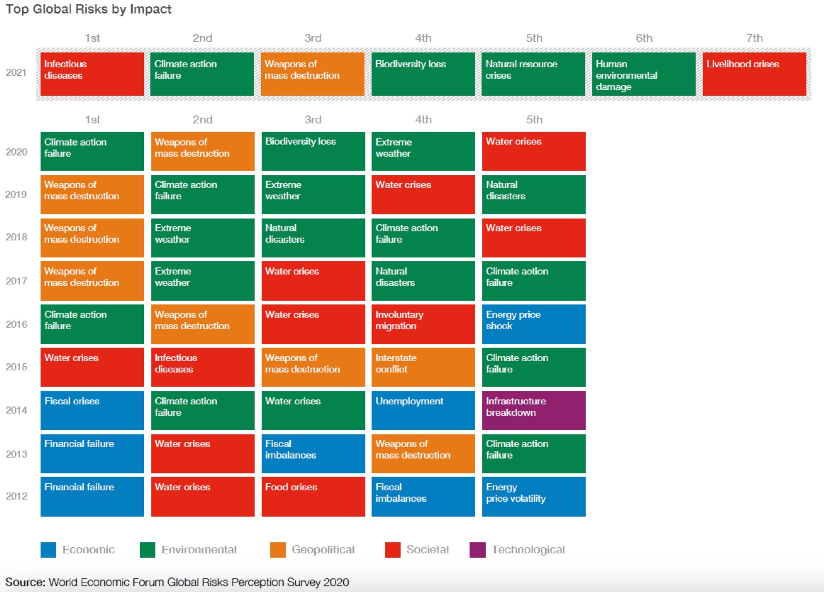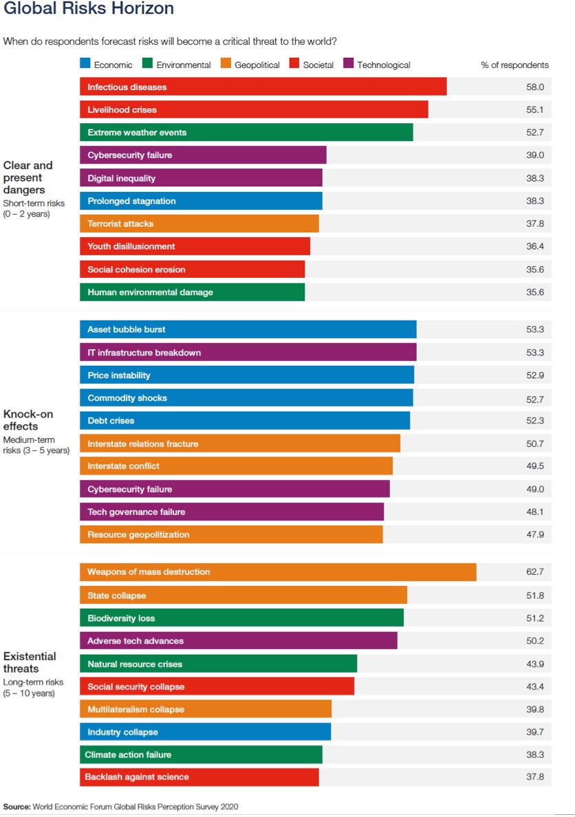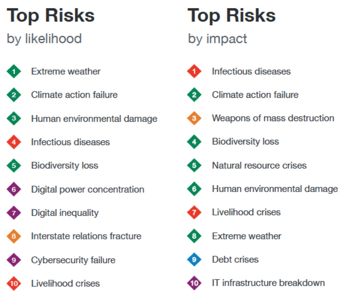 A tabela de impactos agrega o altíssimo impacto da pandemia sobre a economia e a necessidade de praticamente parar diversos processos econômicos em 2020 e também a ameaça de armas de destruição em massa, sem tirar a urgência do enfrentamento dos impactos advindos dos temas relacionados ao meio ambiente e o consumo do capital natural em taxas superiores ao potencial de regeneração, que pode comprometer sobremaneira a capacidade de suporte do planeta como um todo.