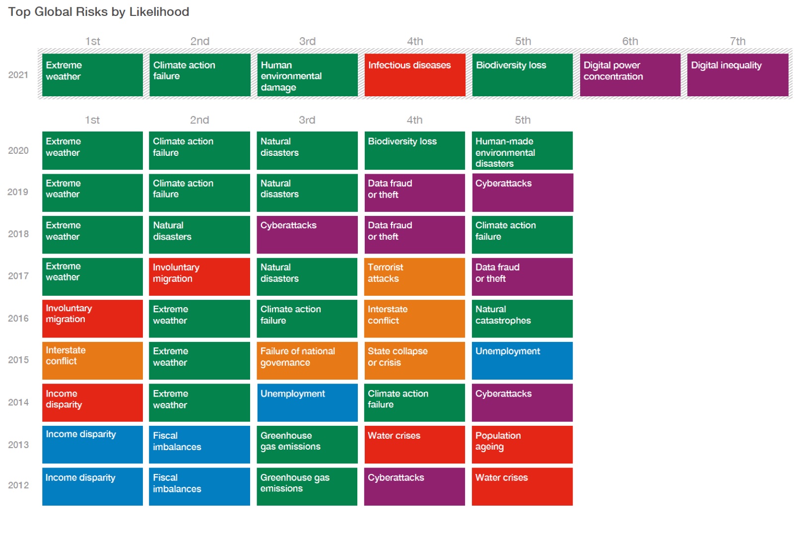 Duas outras tabelas interessantes que aparecem no trabalho permitem identificar a evolução dos impactos e probabilidades de ocorrência desde 2012. Se é possível retirar uma tendência das tabelas abaixo, é de que os riscos de eventos extremos, das mudanças climáticas e da perda de biodiversidade, dentre outros, apresentam prevalência dentro da tabela de probabilidades de ocorrência.