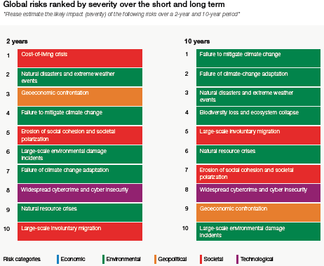 Os riscos em curto prazo (horizonte de dois anos) ainda consideram 5 parâmetros relacionados aos sistemas naturais como cruciais, visto que carregam em si o potencial de gerar novas crises políticas, sociais, econômicos e ecológicas de difícil enfrentamento.