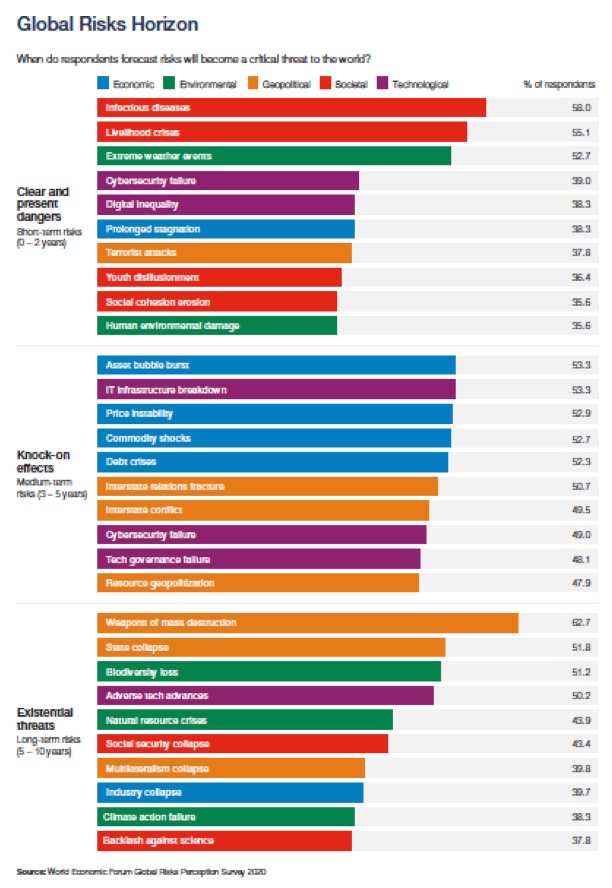 Uma novidade do relatório deste ano são a divisão de riscos entre curto, médio e longo prazo e a categorização de acordo com a intensidade. Os riscos claros e presentes sob impacto das doenças infecciosas (especialmente COVID-19), as crises que geram refugiados em grande escala, os riscos com potencial de potencializar outros riscos e os riscos existenciais, que comprometem a vida humana na Terra.