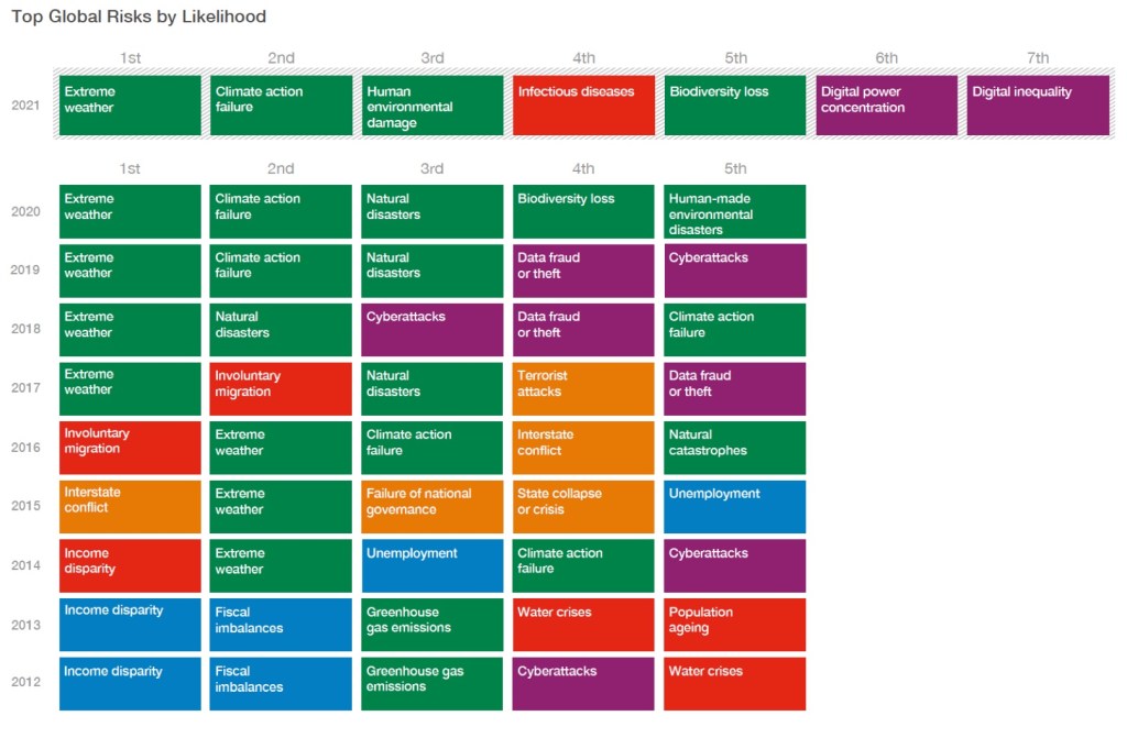 O relatório Global Risks Report é publicado anualmente pelo Forum Econômico Mundial e identifica e categoriza os maiores riscos globais aos quais a humanidade está sujeita a curto e longo prazo. Estes riscos são identificados tendo por premissas três pontos principais, os quais permitem a avaliação de relevância, impacto e o grau de gestão sobre os riscos.