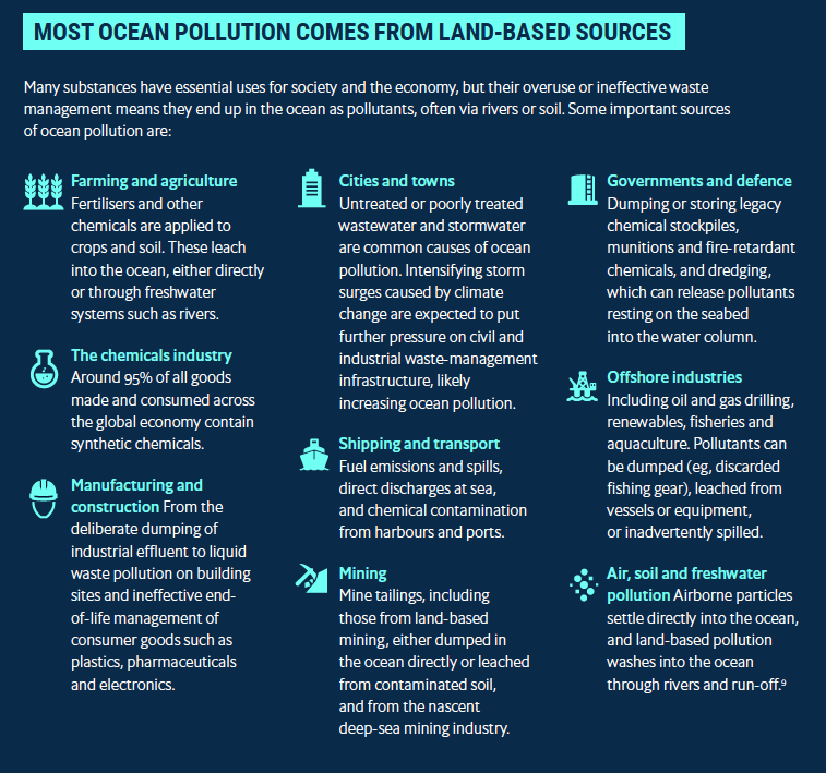 Quadro 1: Principais fontes de poluição marinha (fonte: a global Ocean free from the harmful impacto of pollution: Roadmap for action, 2024)